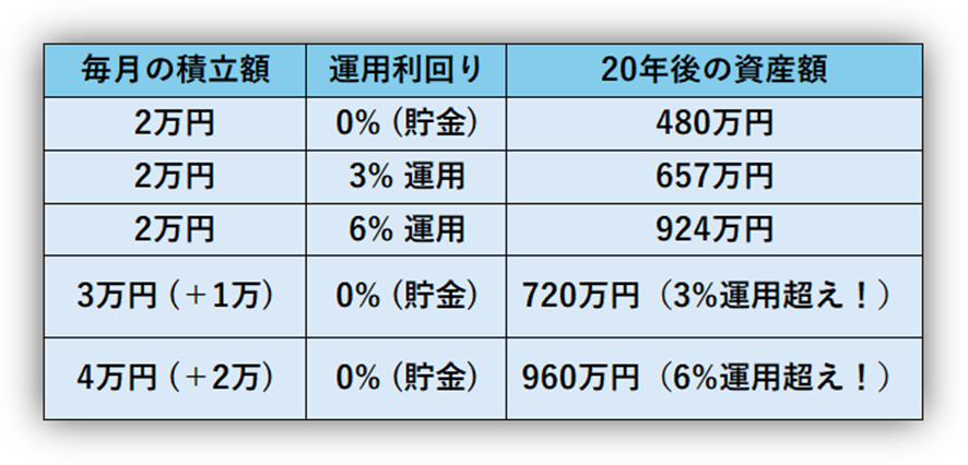 「自分ではコントロールできない相場環境に身を任せて高い運用利回りを20年間期待し続ける」よりも、「頑張って月々の入金を増やす」ほうが、運用リスクを一切取らずに、手元に残る金額は大きくなるのです。