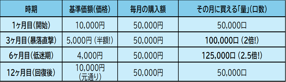 注目すべきは、価格が下がっている時期の「買える量(口数)」です。